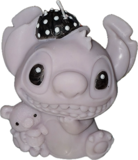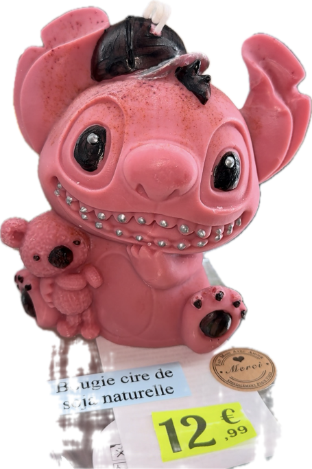 Bougie grand stitch violet rose avec casquette noir pois blancs .Chaque sujet est unique et peut présenter des différences d’aspects et couleurs d’un modèle à l’autre Composée de cire de soja végétale, vous avez la possibilité de choisir votre parfum De Grasse parmi ceux proposés. Environ 330 grammes